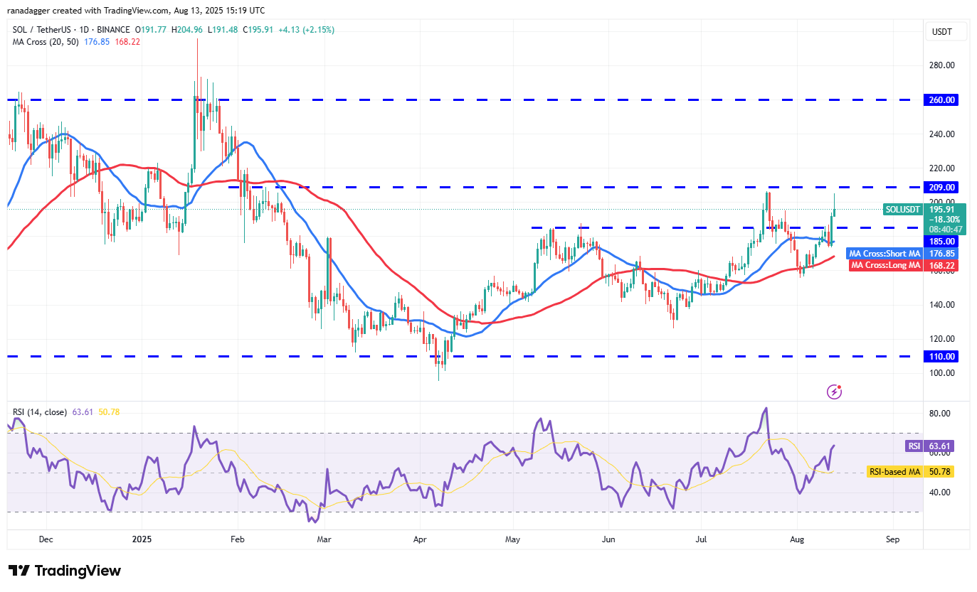 Solana (SOL) turned up sharply from the 20-day SMA ($176) and surged above the $185 resistance on Tuesday.