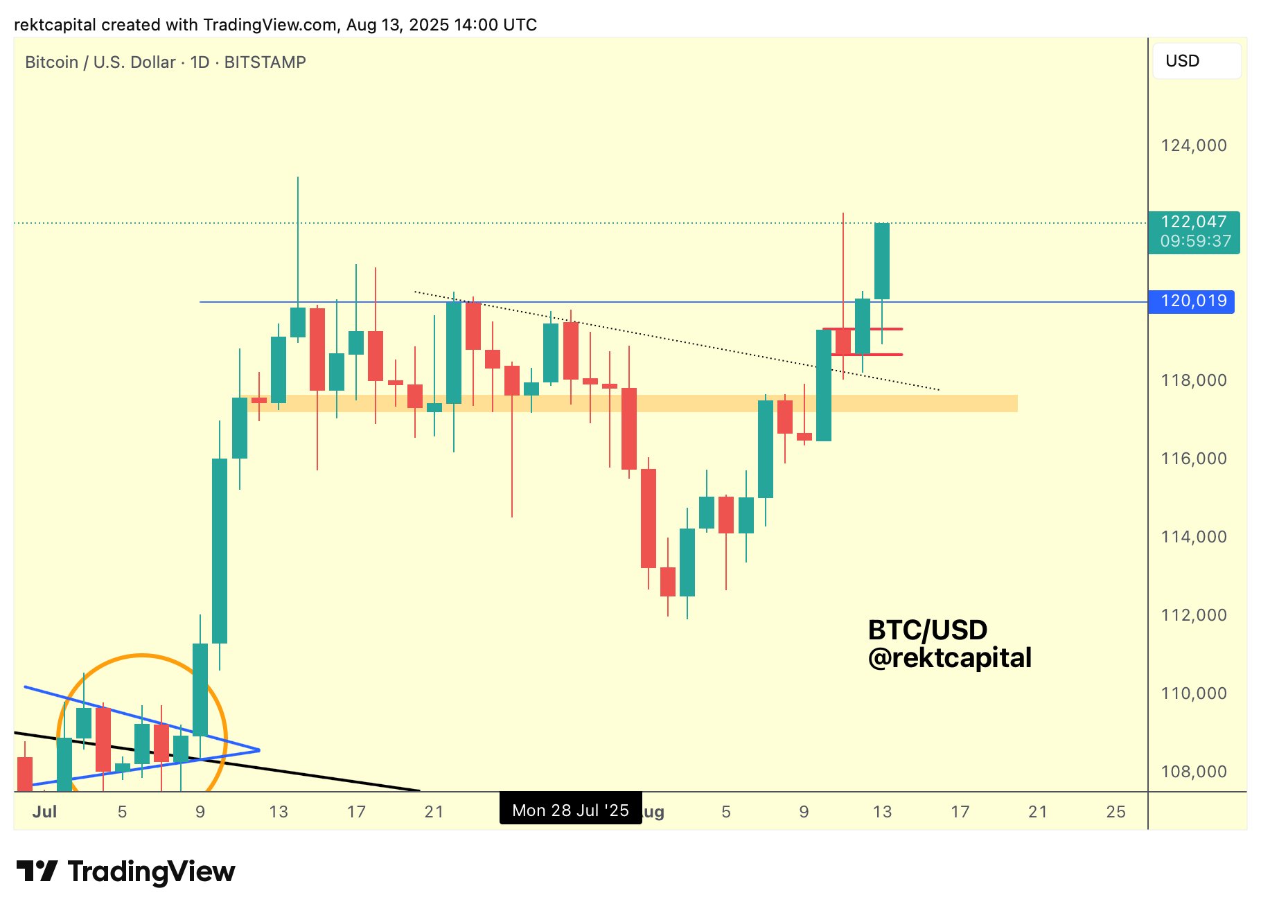 In further good news for the bulls, popular trader and analyst Rekt Capital said that $120,000 was now BTC price support.