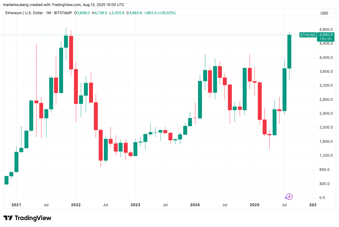 Ether comes within $150 of new all-time highs as institutional interest surges.