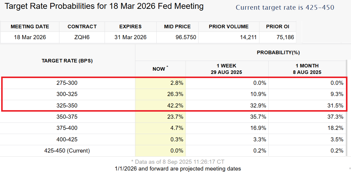 Traders now assign a 73% probability that interest rates will fall to 3.50% or lower by March 2026, up from 41% just one month ago, according to the CME FedWatch tool.
