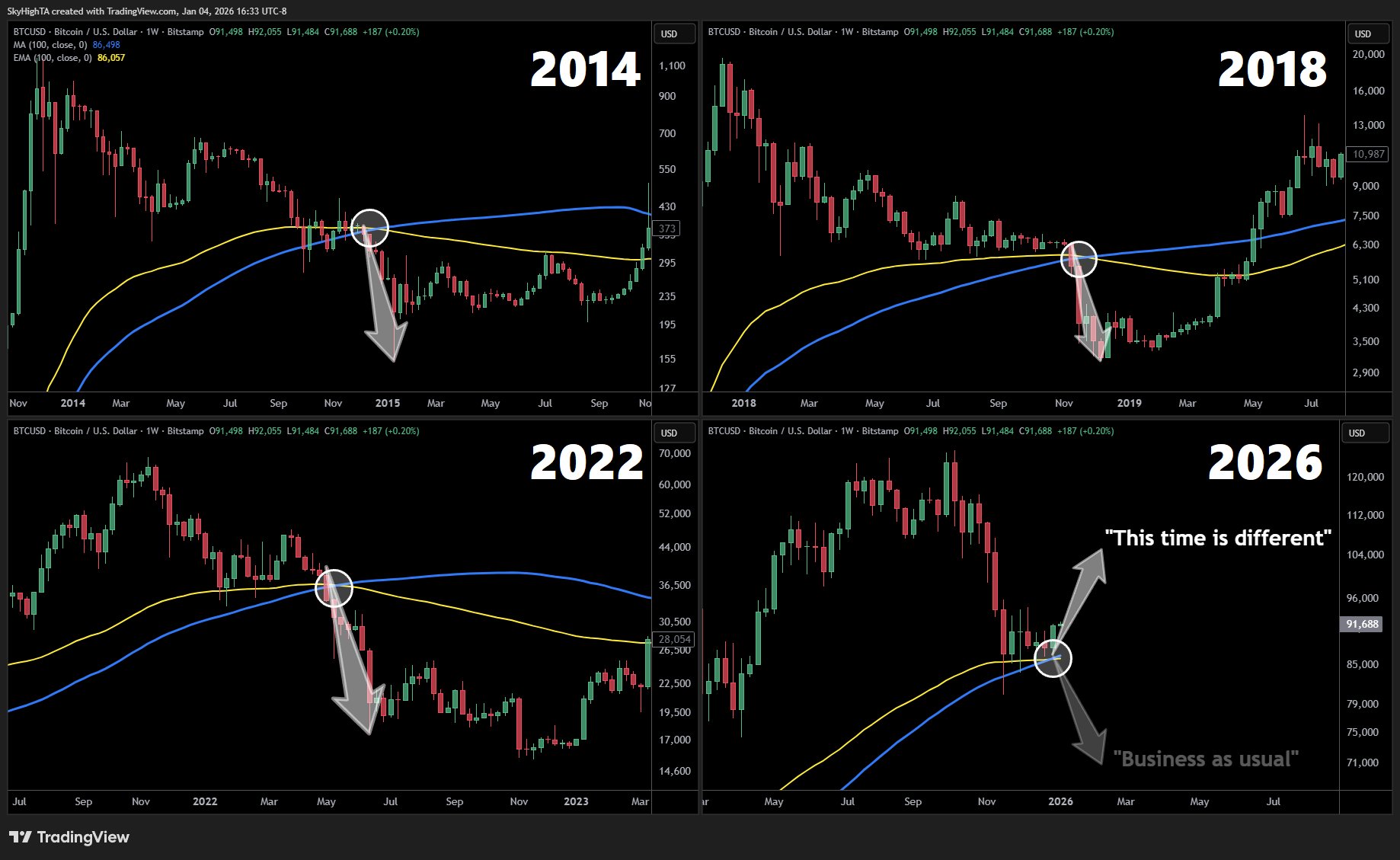 “Historically, the weekly 100 EMA and SMA cross deep in the bear. Each prior cycle saw a 50%+ crash to the cycle bottom within weeks,” SuperBro wrote on X.
