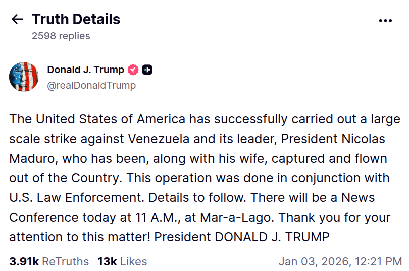 “We’re seeing some short-term selling pressure due to the ongoing US action against Venezuela, but I remain bullish in the near term,” analytics account @Wealthmanager reacted in a post on X.
