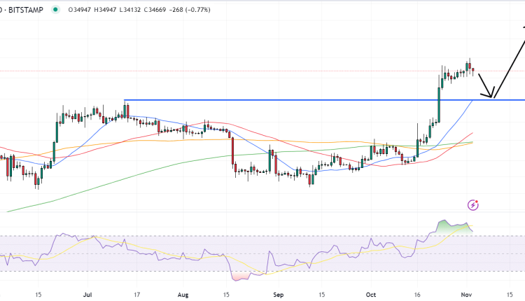 Economic data released earlier on Friday revealed a larger-than-expected slowdown in the US jobs market in October, triggering downside in US bond yields and a pump in the US stock market and price of Bitcoin (BTC), which was last around $34,600.