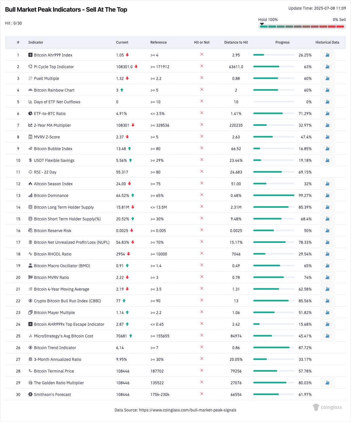 As Cointelegraph reported, a giant list of 30 “bull market peak” indicators from monitoring resource CoinGlass remains 100% in “hold” territory.