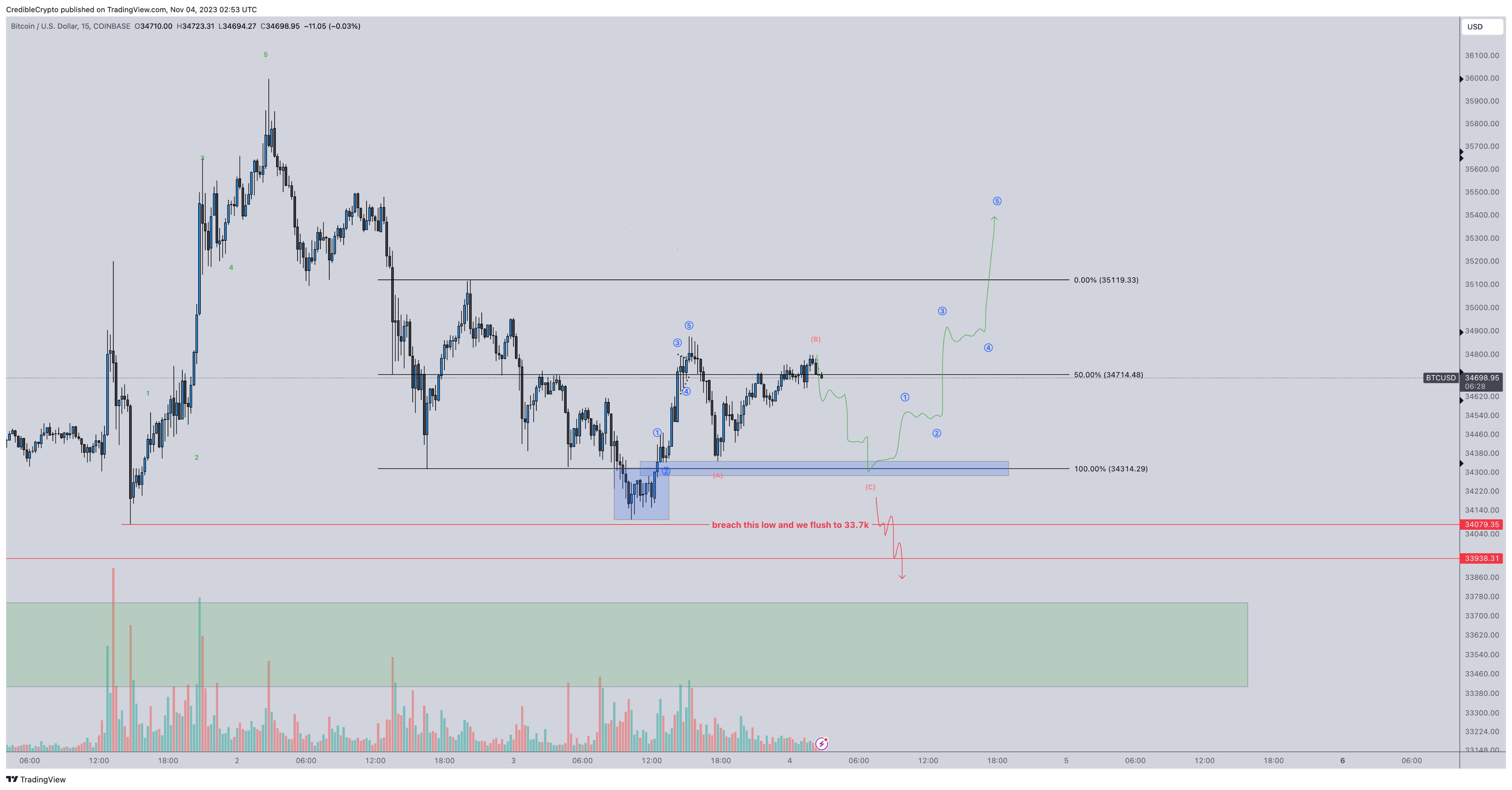 Uploading Elliott Wave analysis to X, Credible Crypto revealed three key levels to watch: $34,314, $34,714 and $35,119, forming the range low, midrange point and high, respectively.