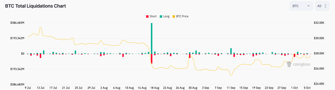Data from monitoring resource CoinGlass showed negligible liquidations across both long and short BTC positions through Oct. 6.