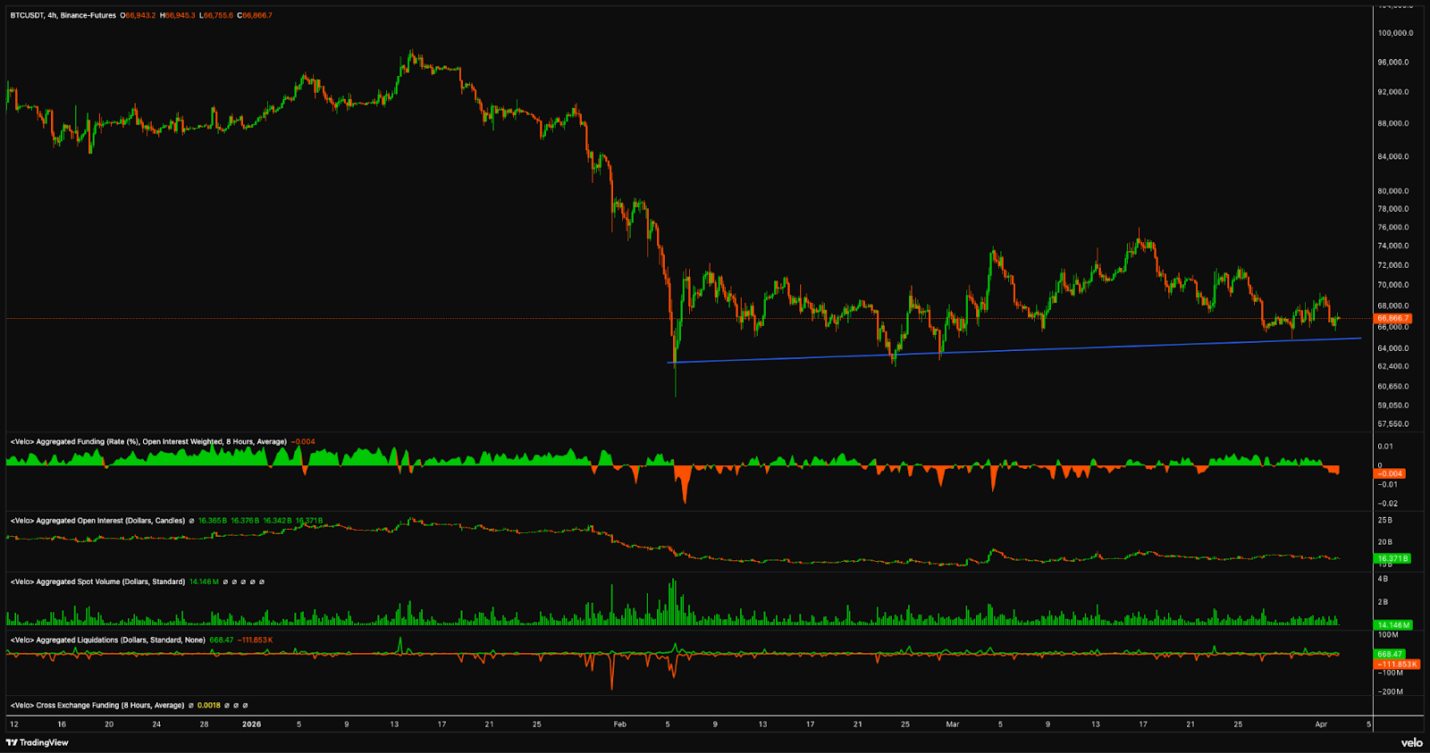 Data from Velo highlights the relatively flat market demand across Bitcoin’s spot and futures markets. Although traders appear to view instances where BTC’s funding rate turns negative as a buying opportunity, their confidence is largely absent during rallies into the bear flag’s trendline resistance.