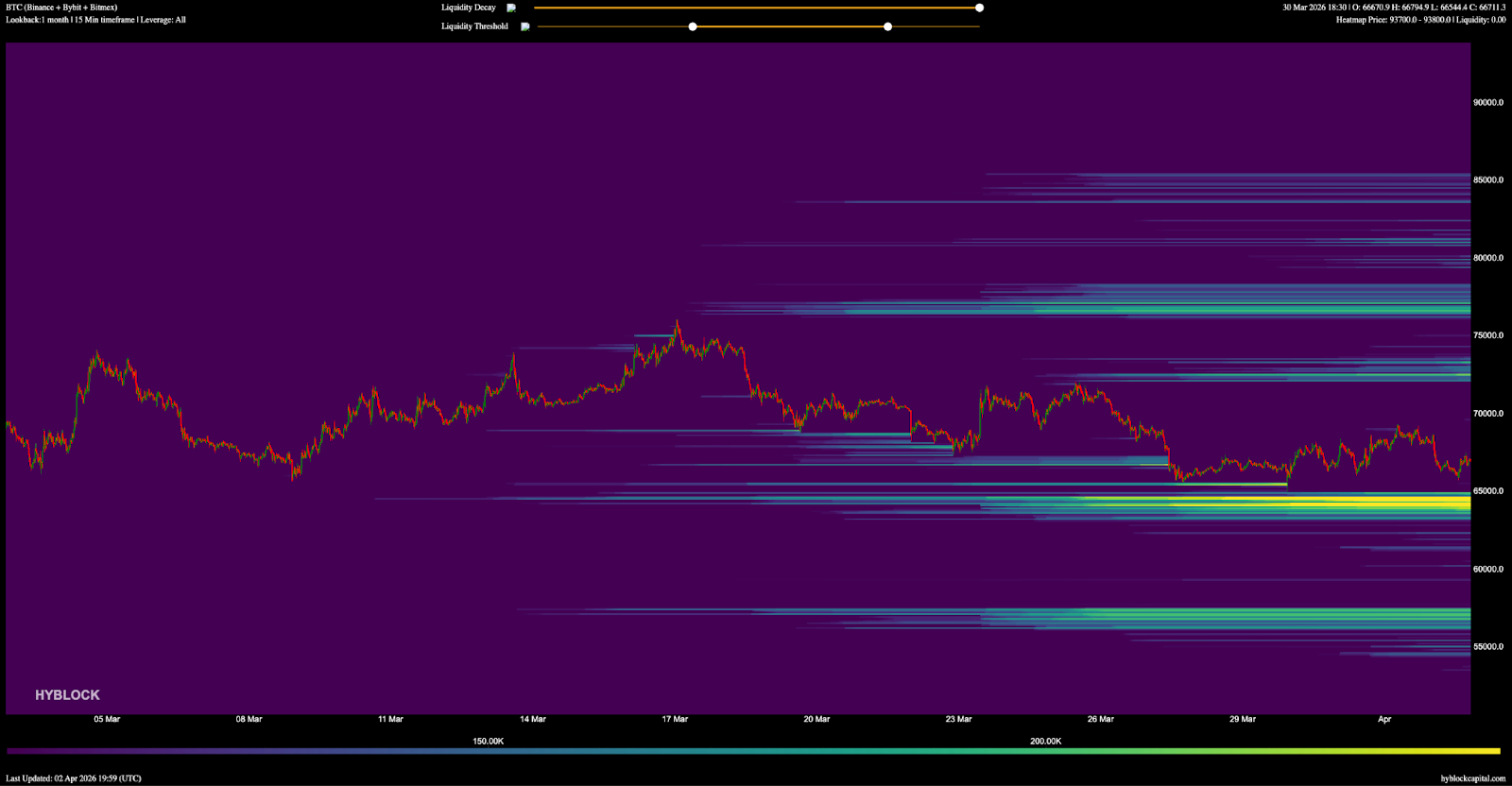 Regarding Kibar’s $52,500 price prediction and its alignment with Bitcoin’s futures markets, Hyblock liquidation heatmap data shows a large number of leveraged long positions at risk of liquidation if BTC falls into the $63,000 to $65,000 range.