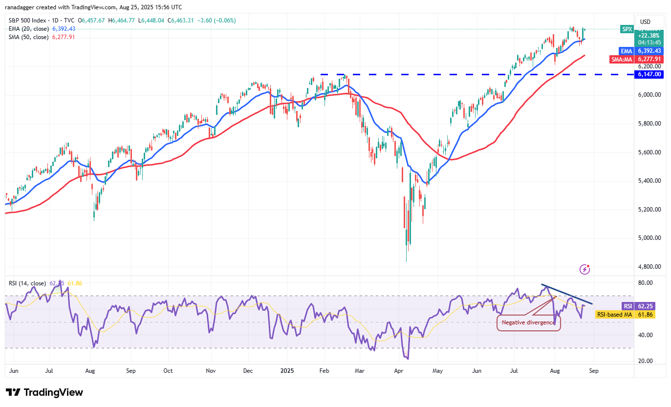 Although the trend remains up, the relative strength index (RSI) is flashing signs of a negative divergence. That suggests the bullish momentum is weakening. The bears will have to pull and retain the price below the 20-day EMA to accelerate selling. The index could then plunge to the breakout level of 6,147.