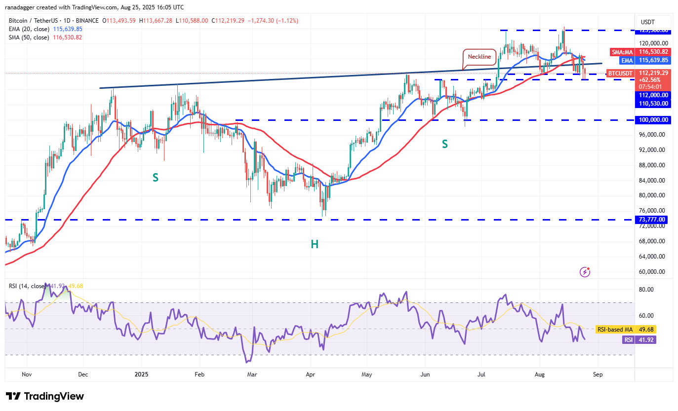 Any recovery attempt is likely to face strong selling at the 20-day EMA ($115,639). If the price turns down from the 20-day EMA, the risk of a break below the $110,530 support increases. If that happens, the BTC/USDT pair could tumble to $105 and then to the psychological level of $100,000.