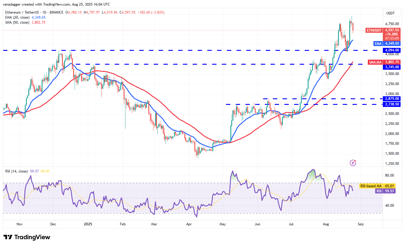The price pulled back on Monday, suggesting profit booking by the short-term traders. The ETH/USDT pair could drop to the 20-day EMA ($4,349), which is a vital level to watch out for. If the price rebounds off the 20-day EMA with strength, the bulls will make one more attempt to propel the pair above $5,000. If they succeed, the Ether price could soar to $5,500.