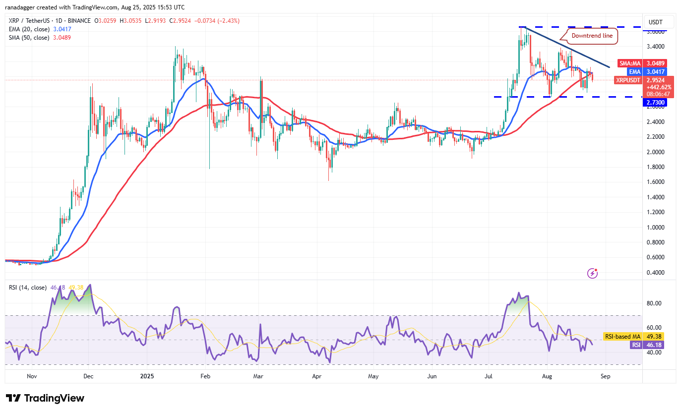 The slightly downsloping 20-day EMA ($3.04) and the RSI just below the midpoint do not give a clear advantage either to the bulls or the bears. If the price turns down from the 20-day EMA, the sellers will make one more attempt to sink the XRP price below $2.73. If they manage to do that, the pair could plummet to $2.33.