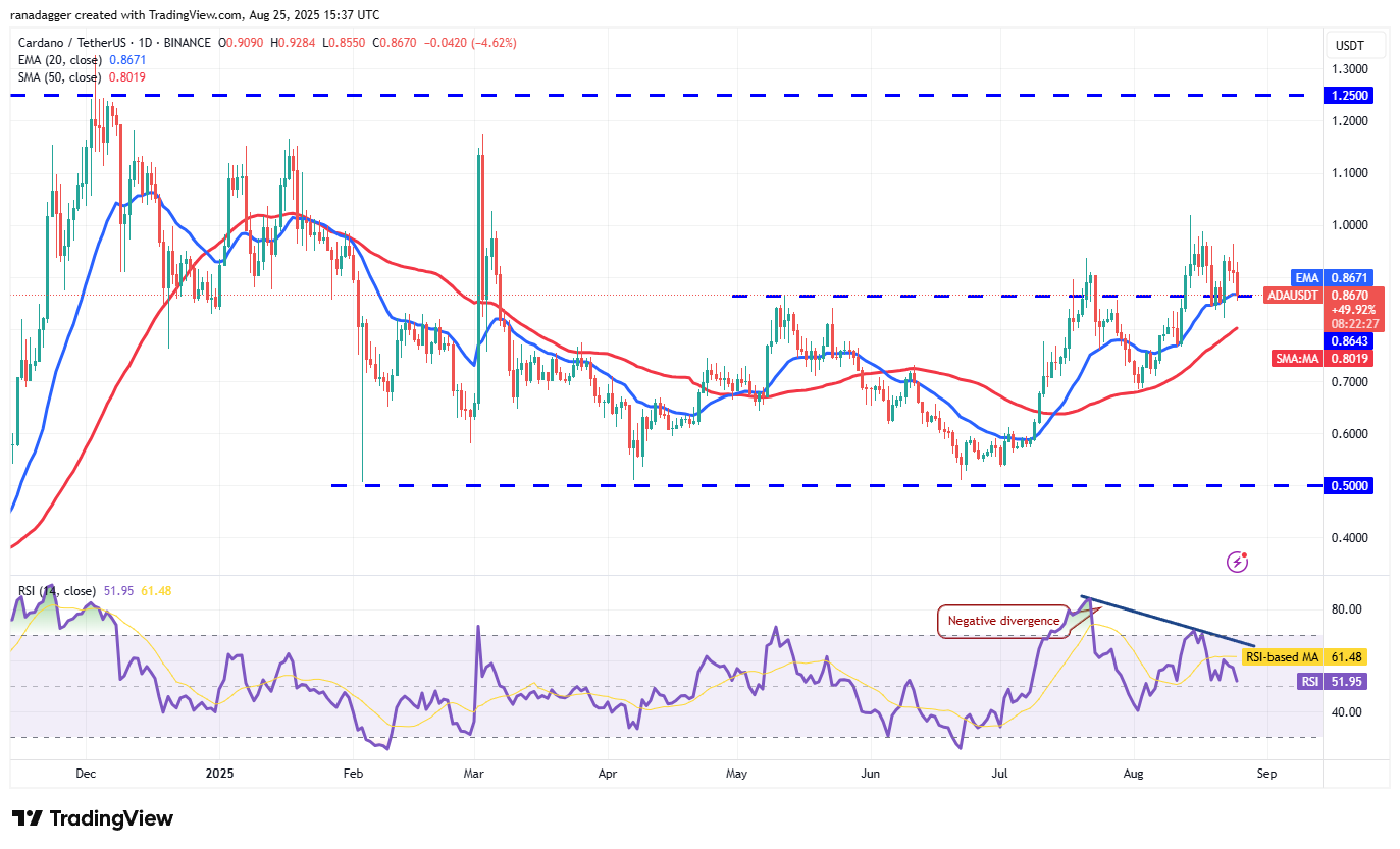 Cardano (ADA) bounced off the 20-day EMA ($0.86) on Friday, but the bulls are struggling to maintain the higher levels.