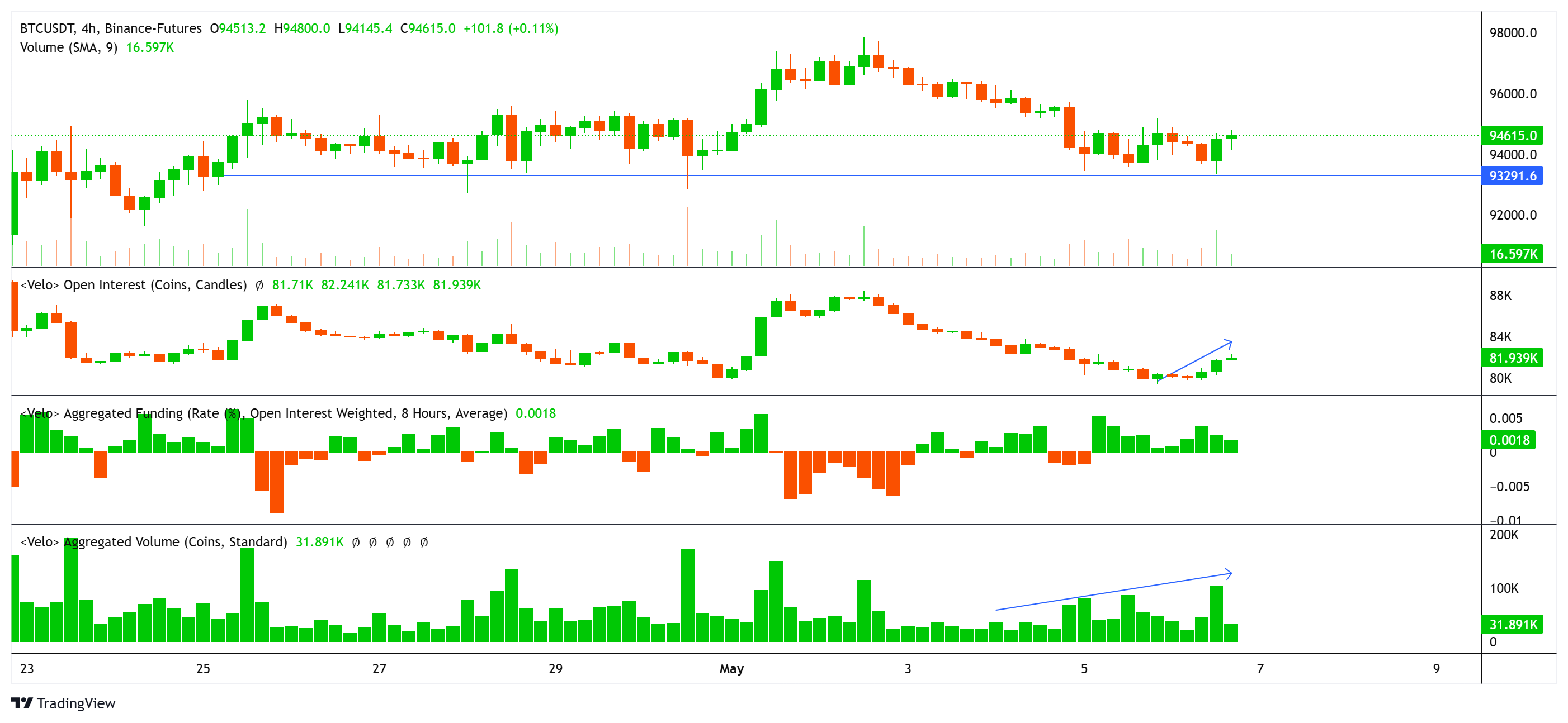 Similarly, Bitcoin futures open interest (OI) exhibited a swift increase of 2,000 BTC, i.e., roughly $189 million, over the past few hours. A rise in OI and a 15% increase in aggregated volume imply consistent buying pressure despite the price dip.