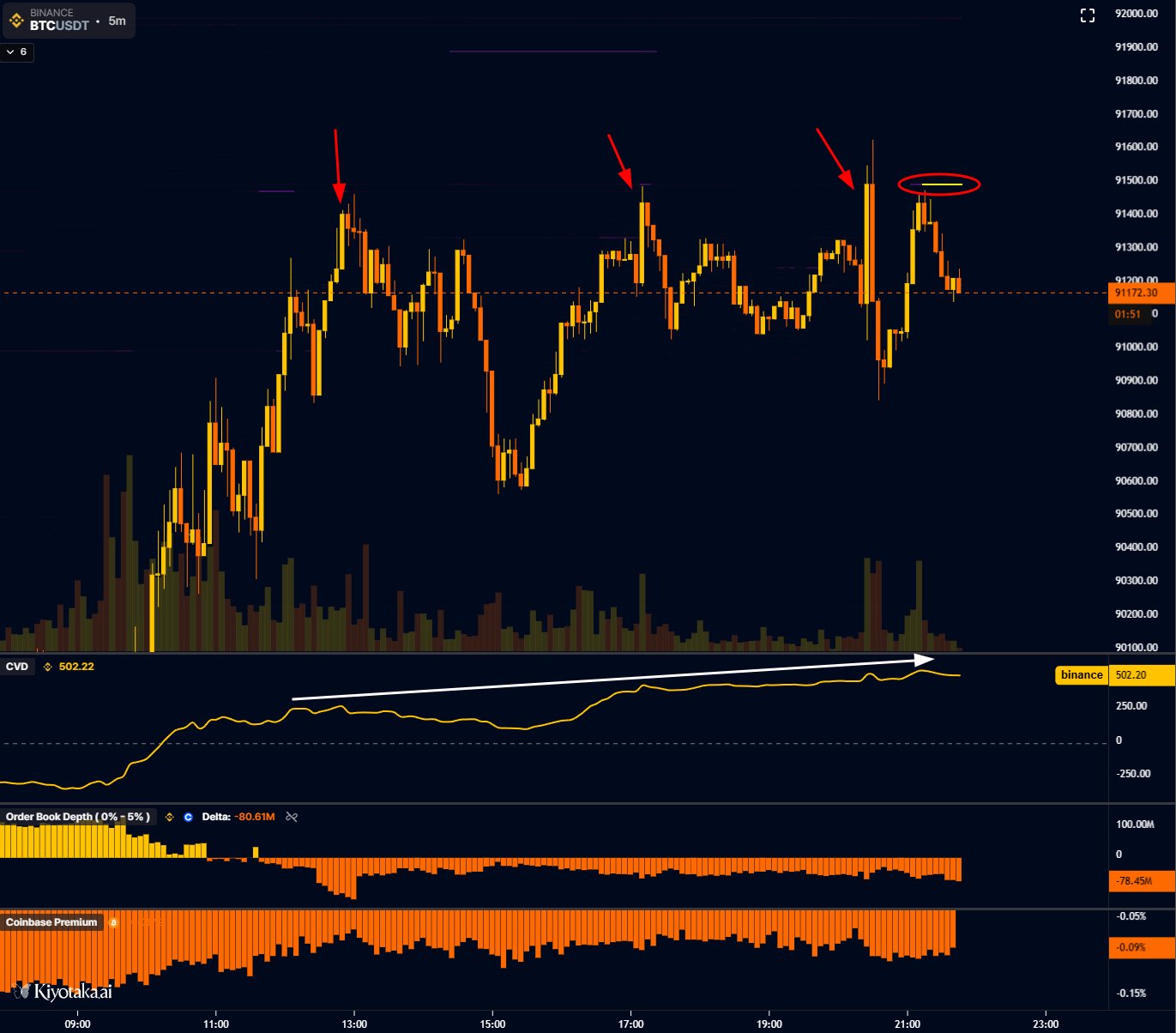 Analyzing exchange order-book behavior on the day, trader Skew flagged a passive seller active at $91,500, keeping price suppressed.