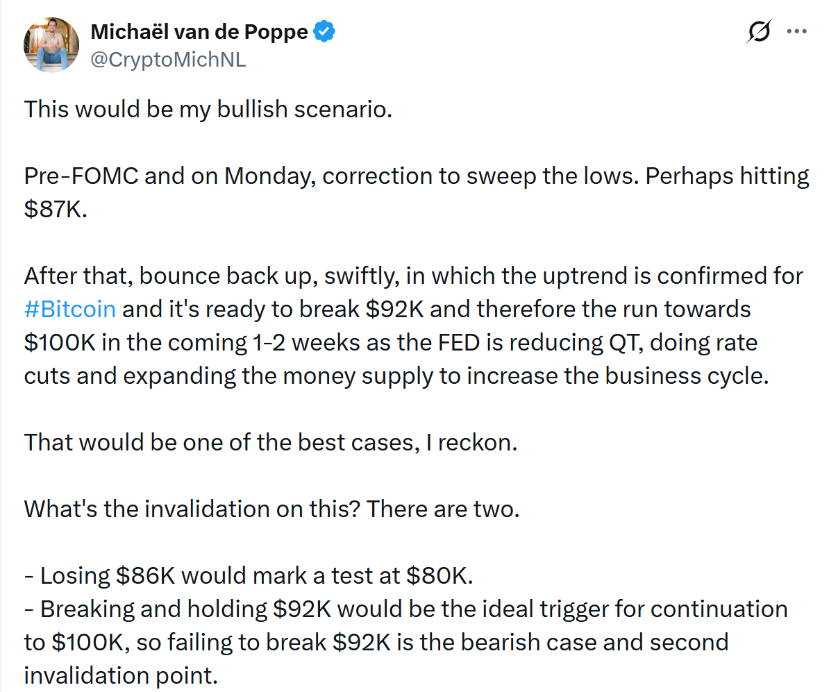 In a Sunday post on X, the analyst outlined a bullish scenario in which BTC dips to around $87,000 ahead of next week’s Federal Reserve meeting, sweeping recent lows before setting the stage for a swift rebound.