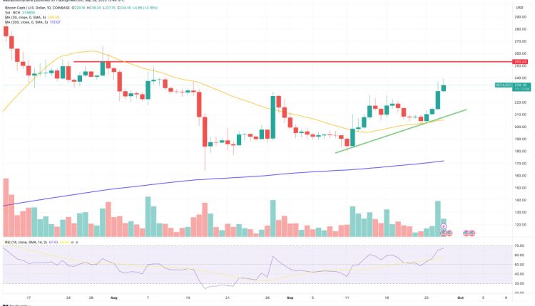 The Bitcoin Cash price has continued rising strongly today after beginning a surge yesterday, with its move to $235.39 representing a 1.5% gain in 24 hours and 12% rise in a week.