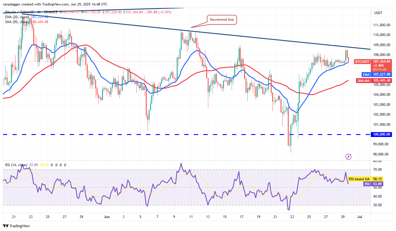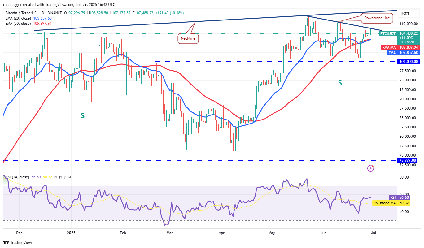 The moving averages are sloping up gradually, and the relative strength index (RSI) is in the positive territory, indicating that bulls have a slight edge. If bulls propel the price above the downtrend line, the BTC/USDT pair could jump to $110,530 and later to $111,980.