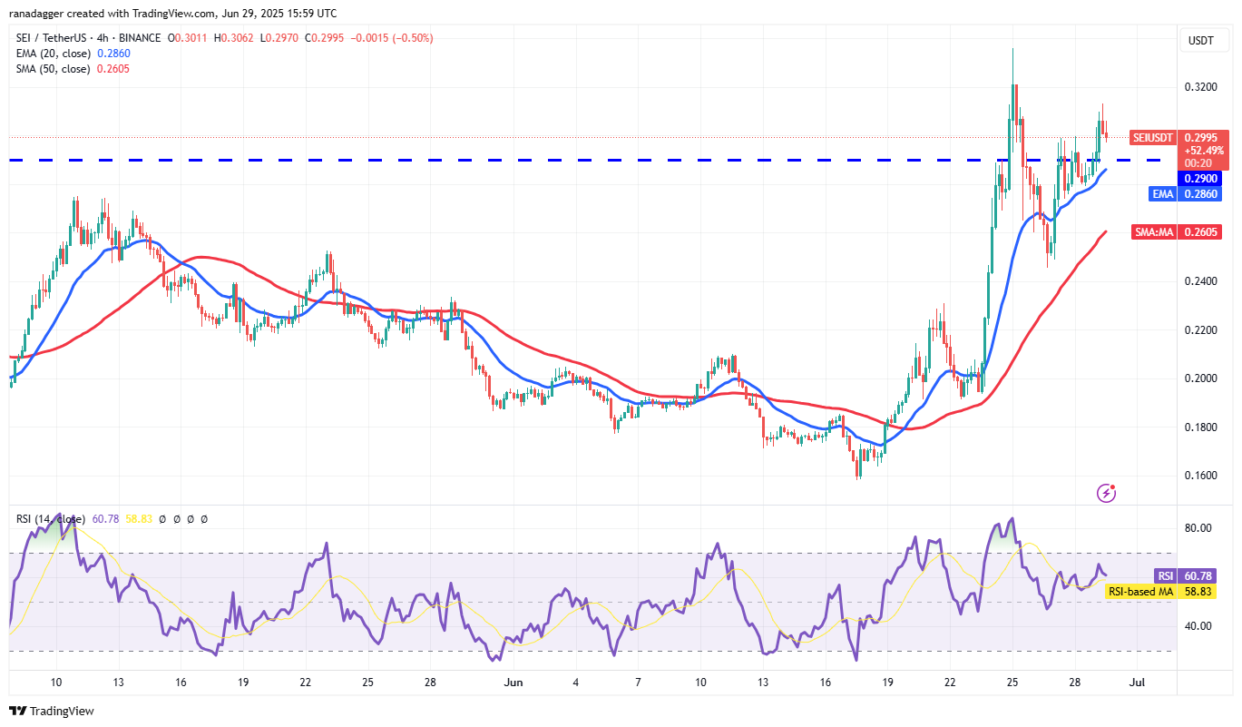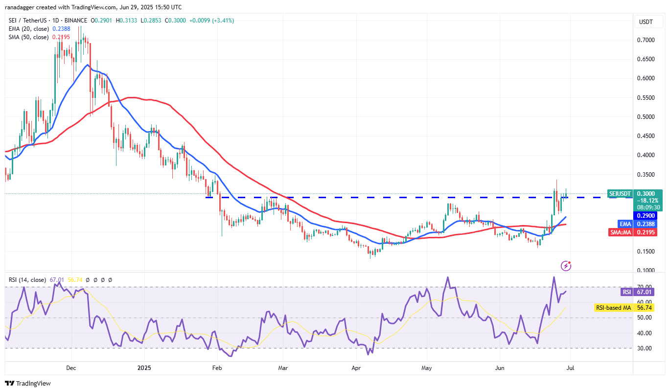 Sei (SEI) picked up momentum after breaking out of the 50-day SMA ($0.21) on Monday and rose above the $0.29 resistance on Tuesday.