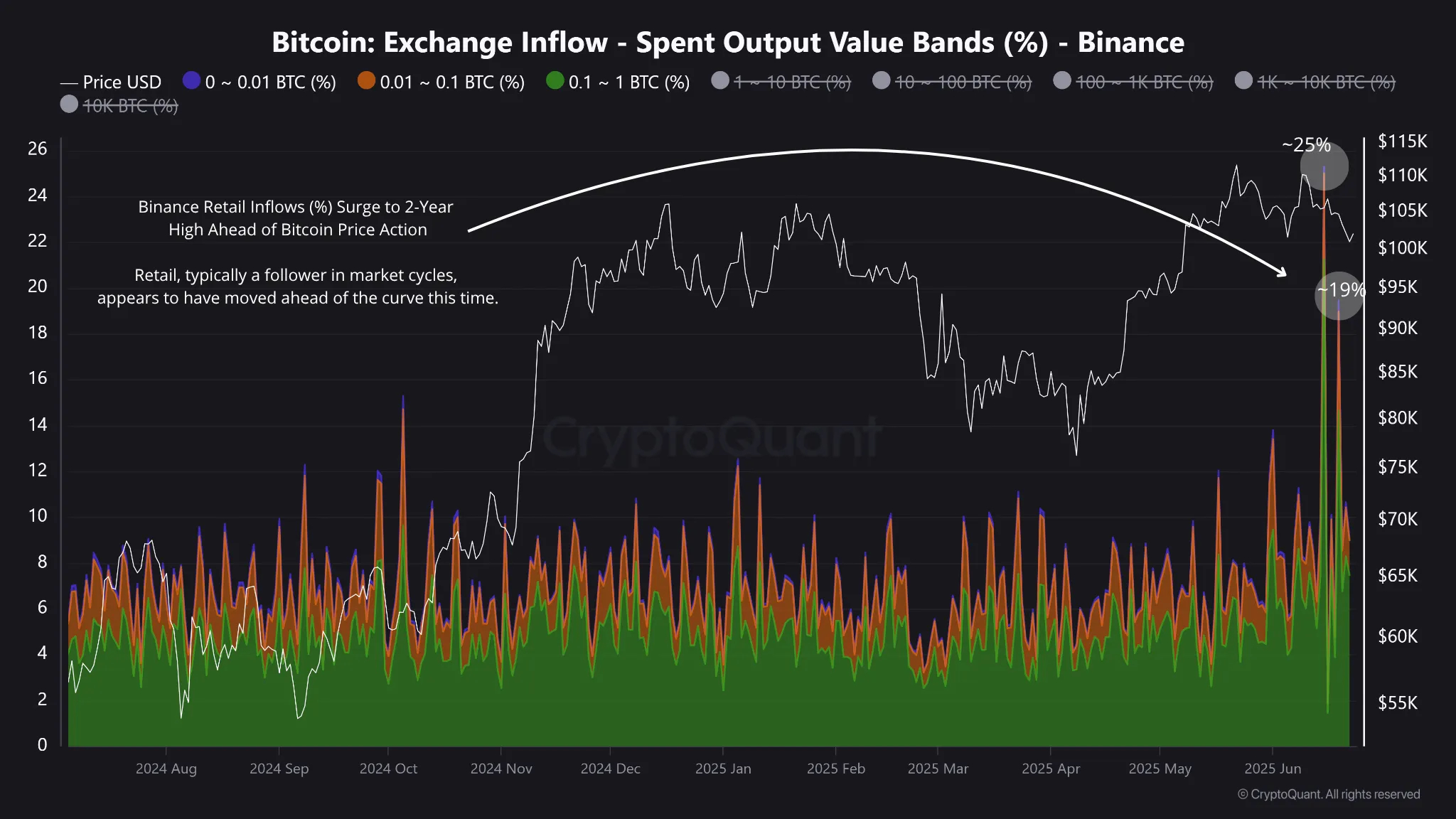 Binance’s retail inflow percentage reached a 2-year high, with a sharp increase in 0–1 BTC exchange deposits, hinting at active retail trading or profit-taking behavior.