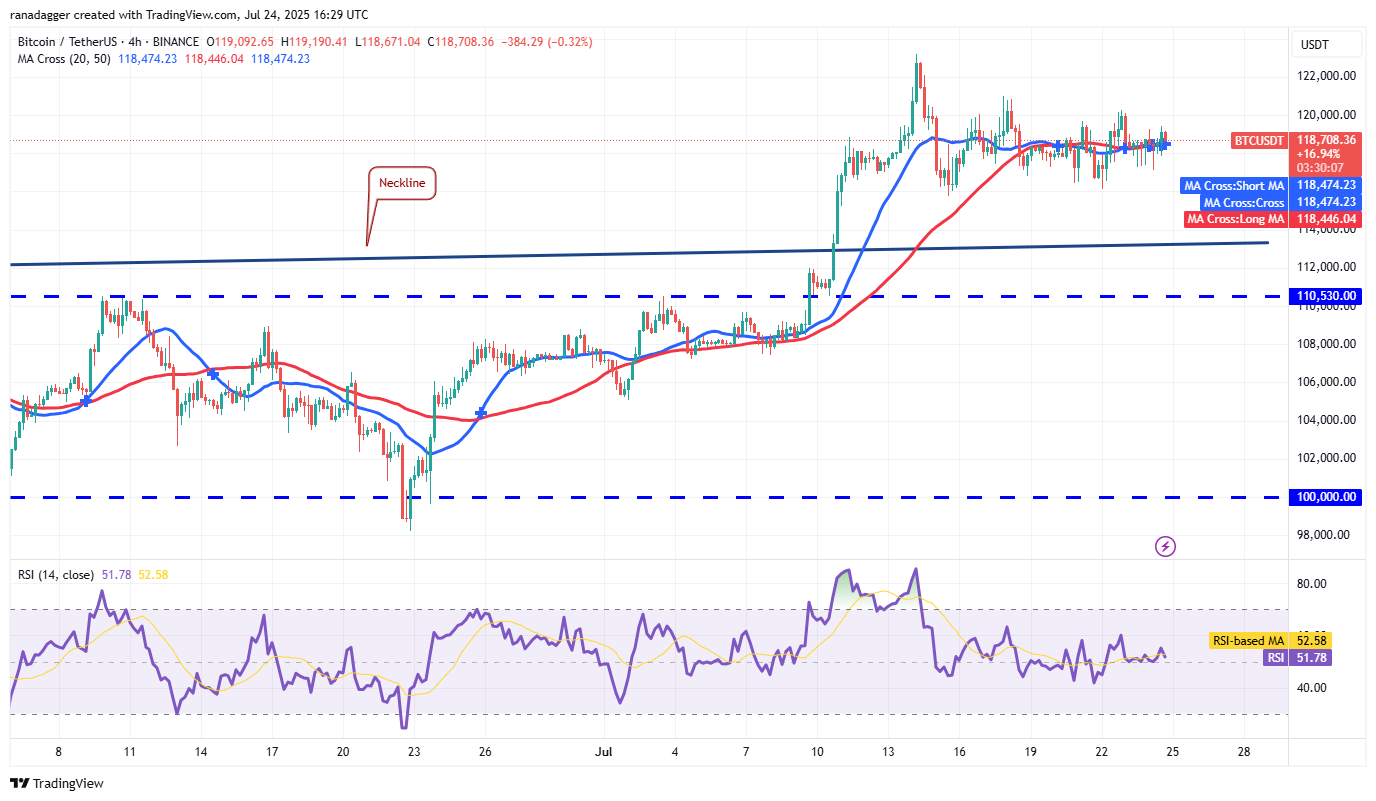 The upsloping 20-day SMA and the relative strength index (RSI) in the positive zone indicate that the path of least resistance is to the upside. If buyers thrust the price above the $120,000 to $123,218 resistance zone, the BTC/USDT pair could resume the uptrend. The pair could skyrocket to $135,729 and later to $150,000.