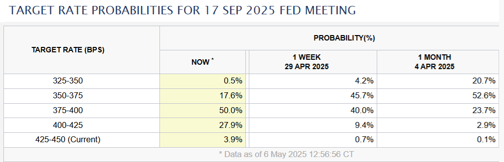 Market expectations, as reflected in Treasury yield futures, show a 76% chance of interest rates at 4.0% or lower by Sept. 17. This probability has dropped considerably from 90% on April 29, according to the CME FedWatch tool.