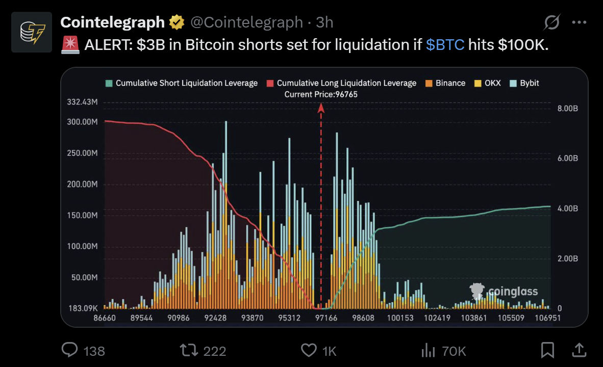This imbalance could propel BTC toward the $100,000 level. Cointelegraph pointed out that over $3 billion is at risk for a short-side liquidation, which may amplify upward momentum, catching bearish traders off guard.