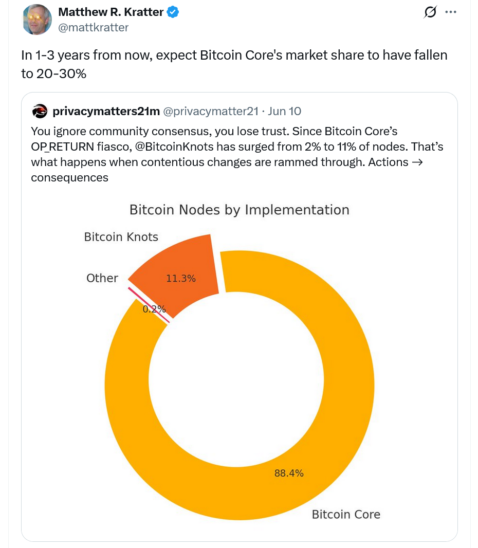 Bitcoin commentator Matthew R. Kratter said the decision to raise the data limit could spell long-term trouble for Bitcoin Core, adding its dominance could fall to the 20-30% range within the next one to three years.