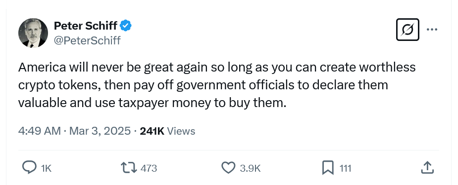 The Trump administration’s move not to implement a Bitcoin-only reserve surprised some, including Bitcoin critic Peter Schiff, who couldn’t see the logic for including altcoins.