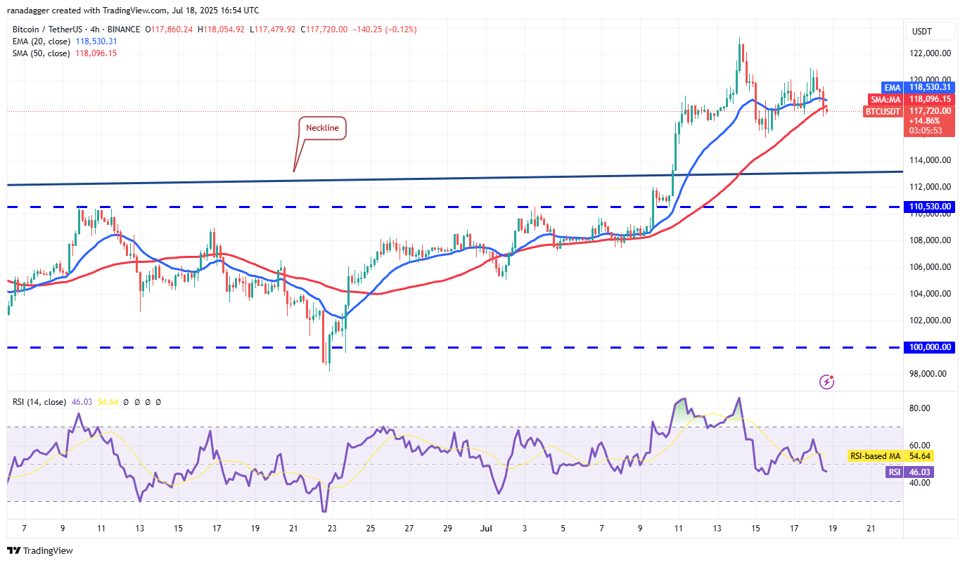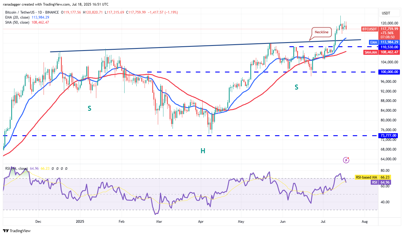 The upsloping 20-day exponential moving average (EMA) ($113,984) and the relative strength index (RSI) in the positive territory indicate an advantage to buyers. If the bulls thrust the price above $123,218, the BTC/USDT pair could resume its uptrend. The pair could surge to $135,729 and thereafter to the pattern target of $150,000.