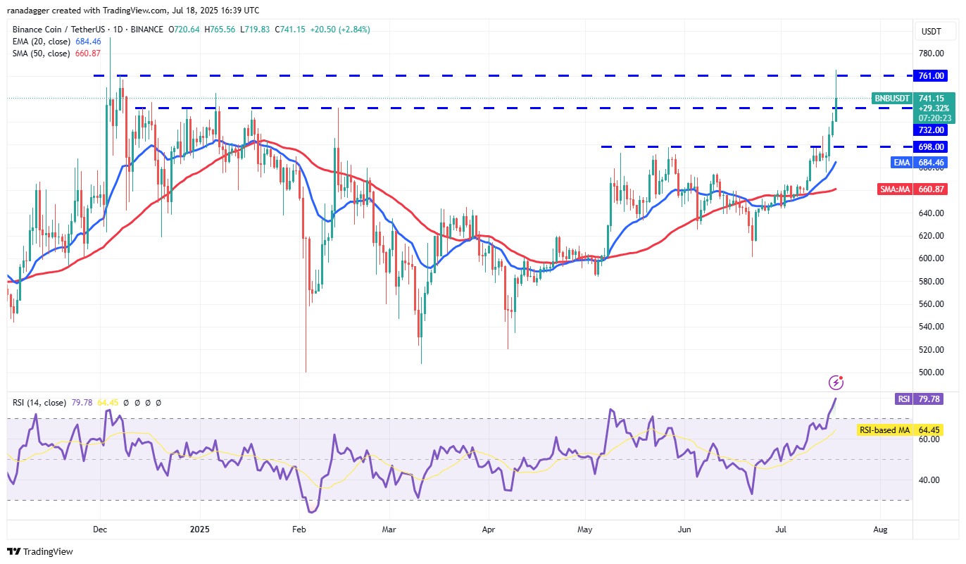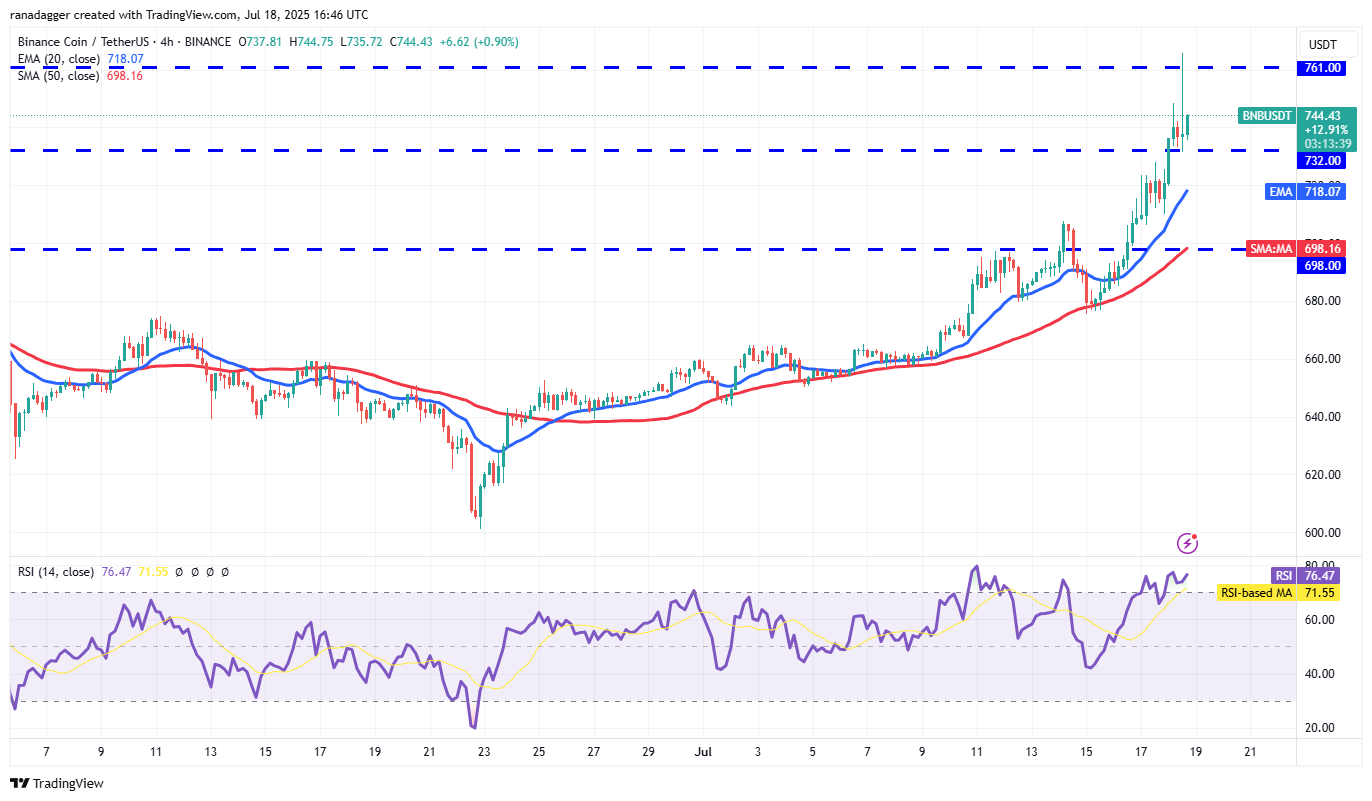 The BNB/USDT pair pierced the $732 resistance and reached the $761 level on Friday, where the bears are mounting a solid defense. If buyers do not allow the price to dip below $732, it suggests a positive sentiment. That enhances the prospects of a break above $761. The pair could then soar to $794.