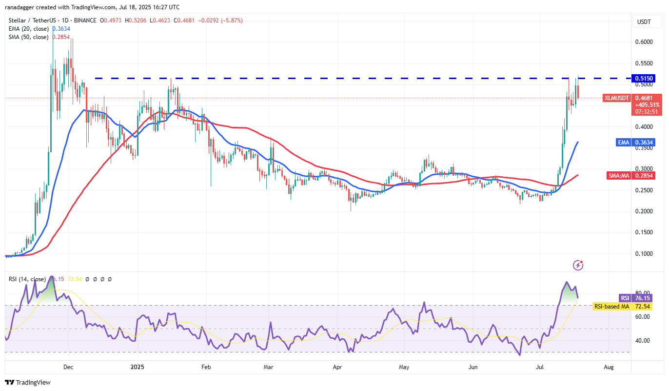 Stellar (XLM) rallied sharply in the past few days and has reached the overhead resistance at $0.51.