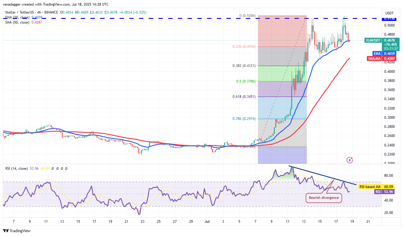 The rally has pushed the RSI into the overbought territory, signaling a possible consolidation or correction in the near term. If buyers do not allow the price to dip below $0.43, the XLM/USDT pair could break out above $0.51. If that happens, the pair may start the next leg of the uptrend to $0.64 and later to the target objective of $0.80.