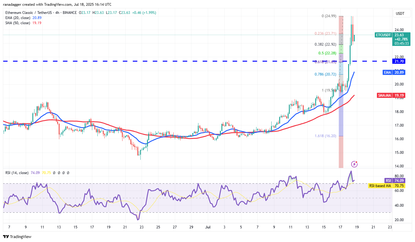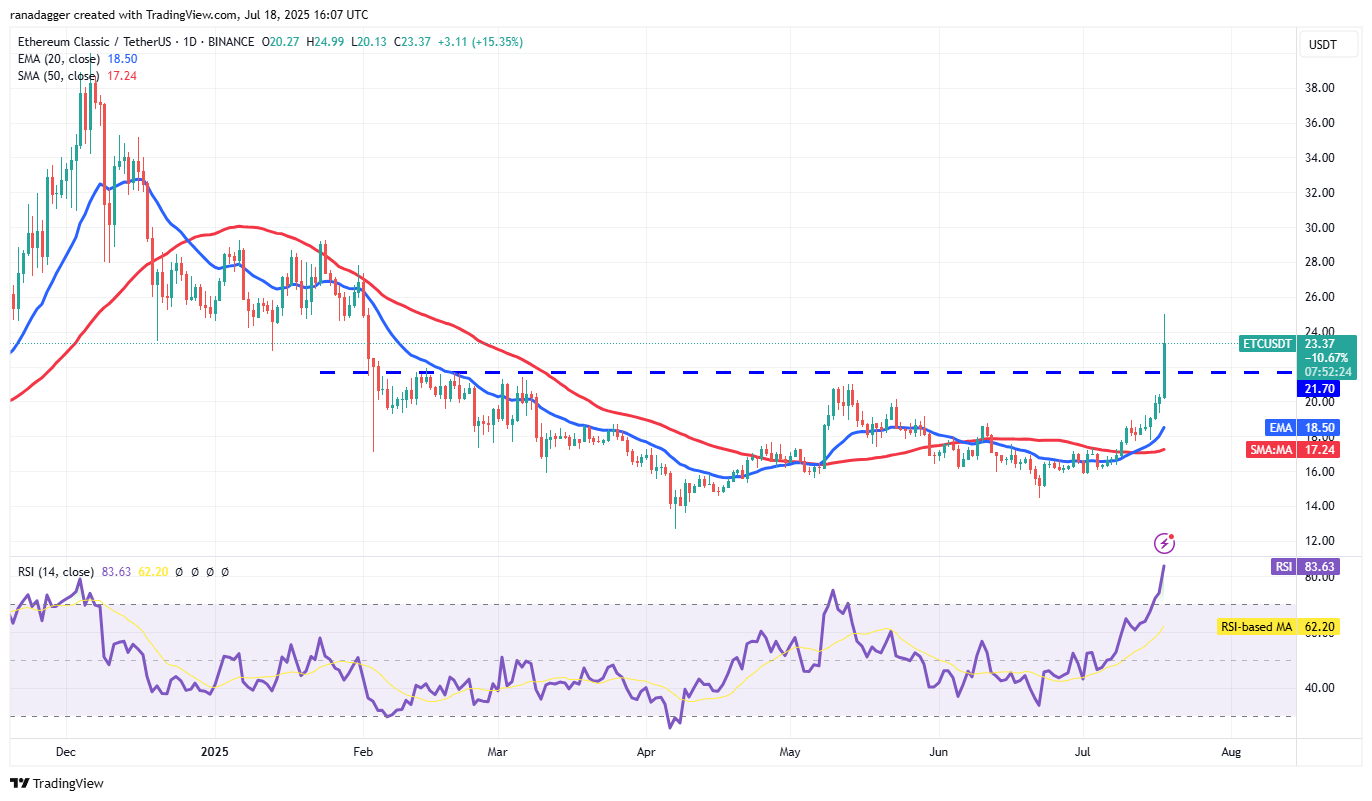 The sharp rally has pushed the RSI into the overbought territory, suggesting a minor consolidation or correction in the near term. The ETC/USDT pair may retest the breakout level of $21.70. If the price rebounds off the $21.70 level with strength, it indicates that buyers have flipped the level into support. That increases the likelihood of a rally to $27.