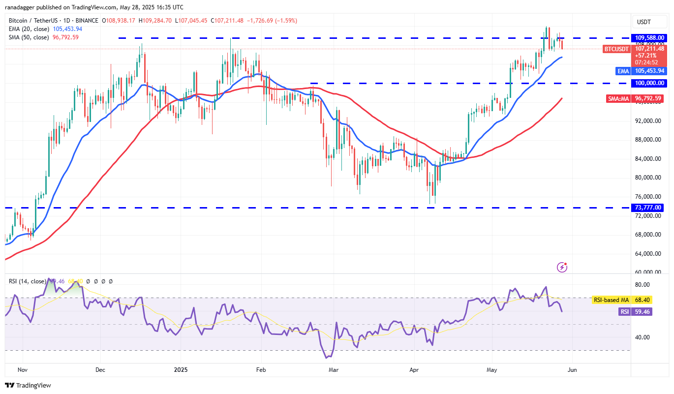The bears will try to pull the price to the 20-day exponential moving average ($105,453), which is a key level to watch out for. If the price rebounds off the 20-day EMA with strength, it suggests that the sentiment remains positive and traders are buying on dips. That improves the prospects of a retest of the $111,980 level. If buyers overcome the $111,980 resistance, the BTC/USDT pair could surge to $130,000.