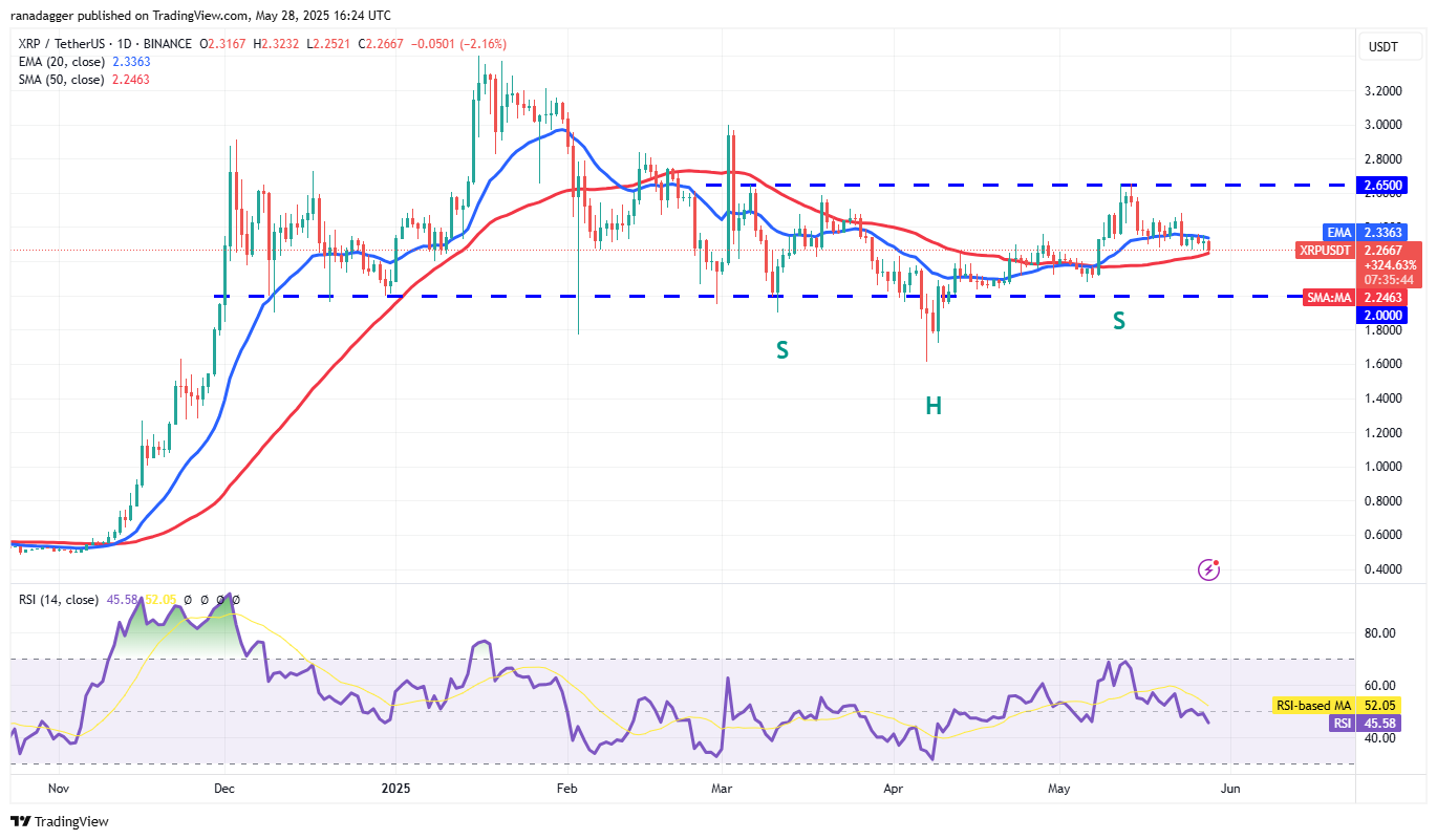 The flattish 20-day EMA ($2.33) and the RSI just below the midpoint do not give a clear advantage either to the bulls or the bears. If the price dips below the 50-day SMA ($2.24), the XRP/USDT pair could dive to the $2 support. Buyers are expected to fiercely defend the $2 level because a break below it may sink the pair to $1.61.