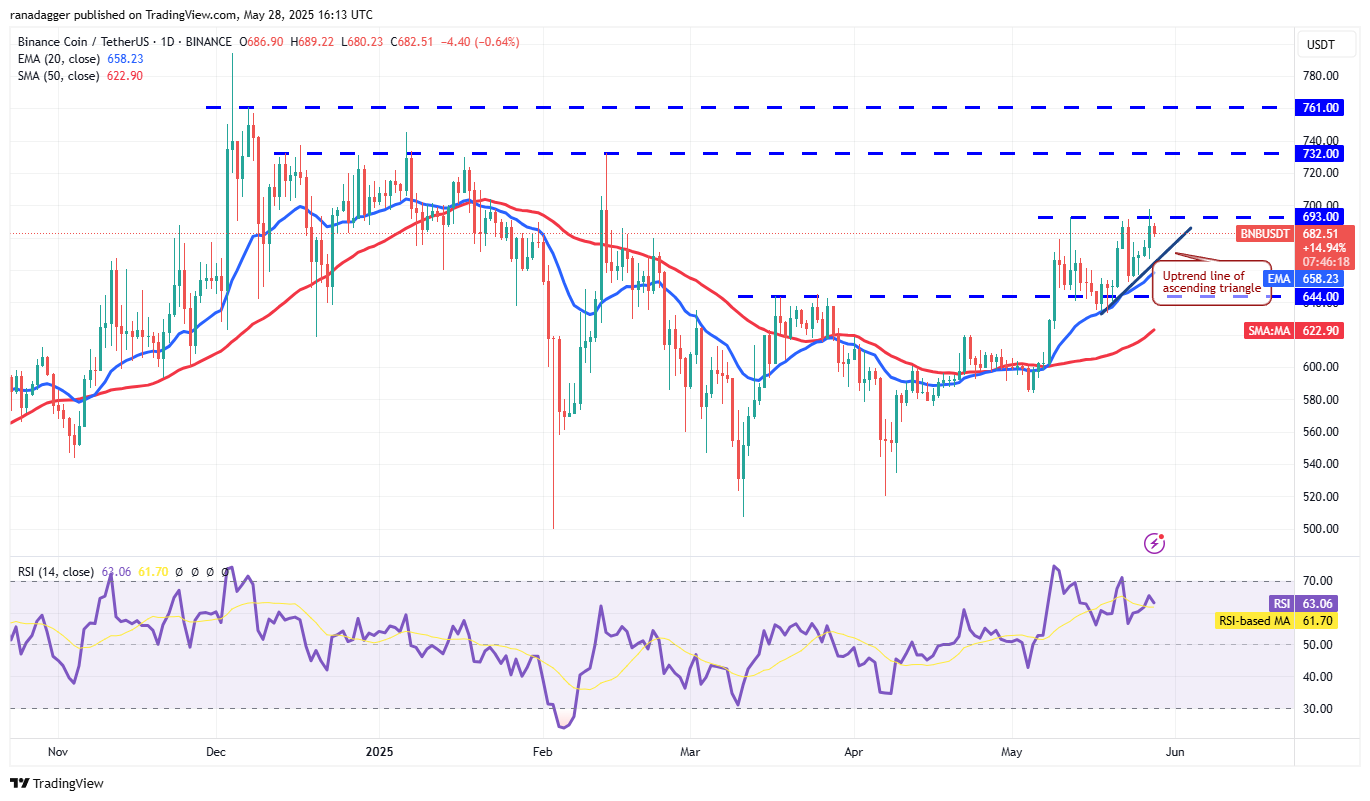 Buyers pushed BNB (BNB) above the $693 resistance on May 27 but could not sustain the higher levels.