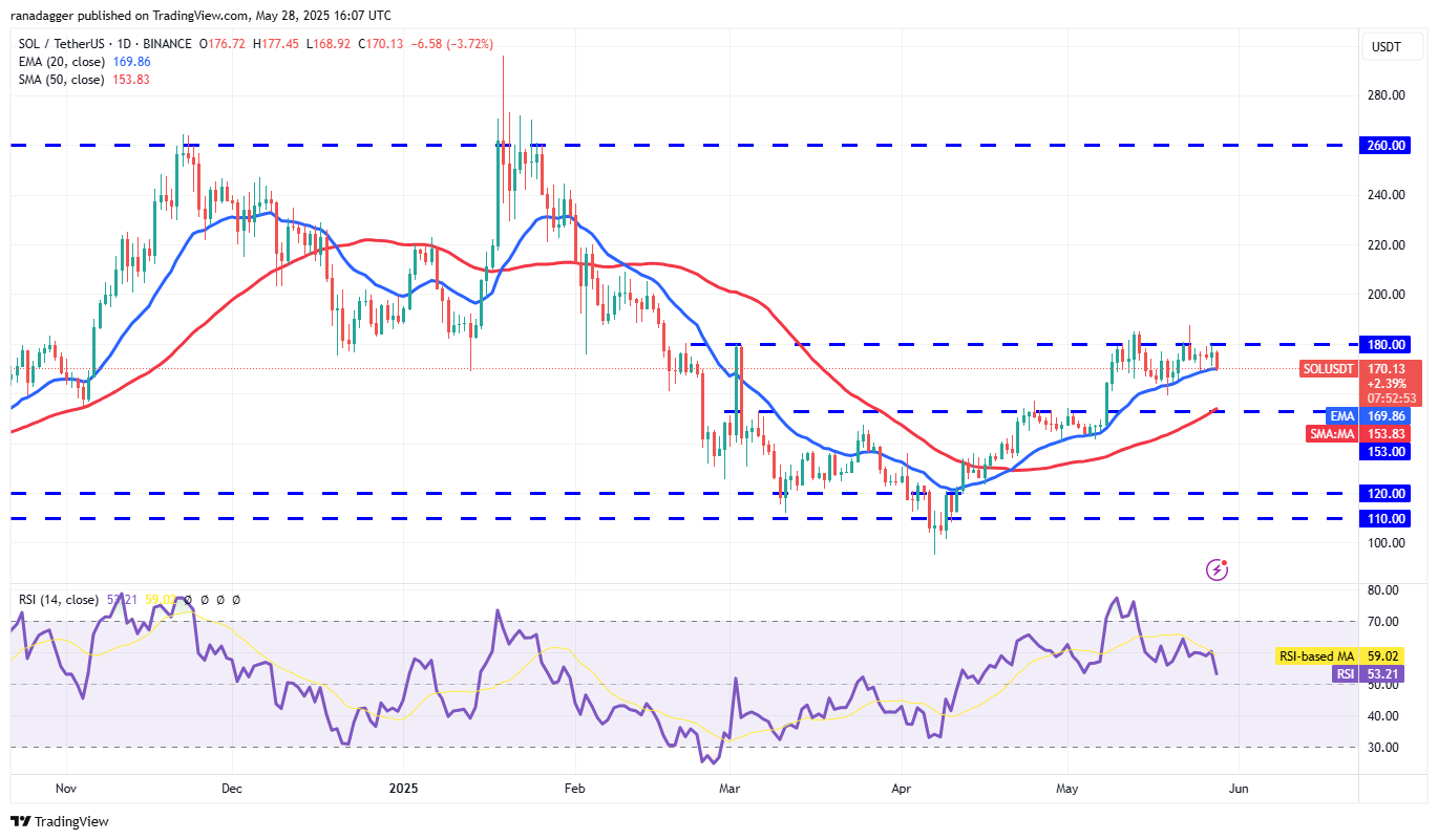 Solana (SOL) has been consolidating inside a narrow range between the 20-day EMA ($169) and the overhead resistance at $180.