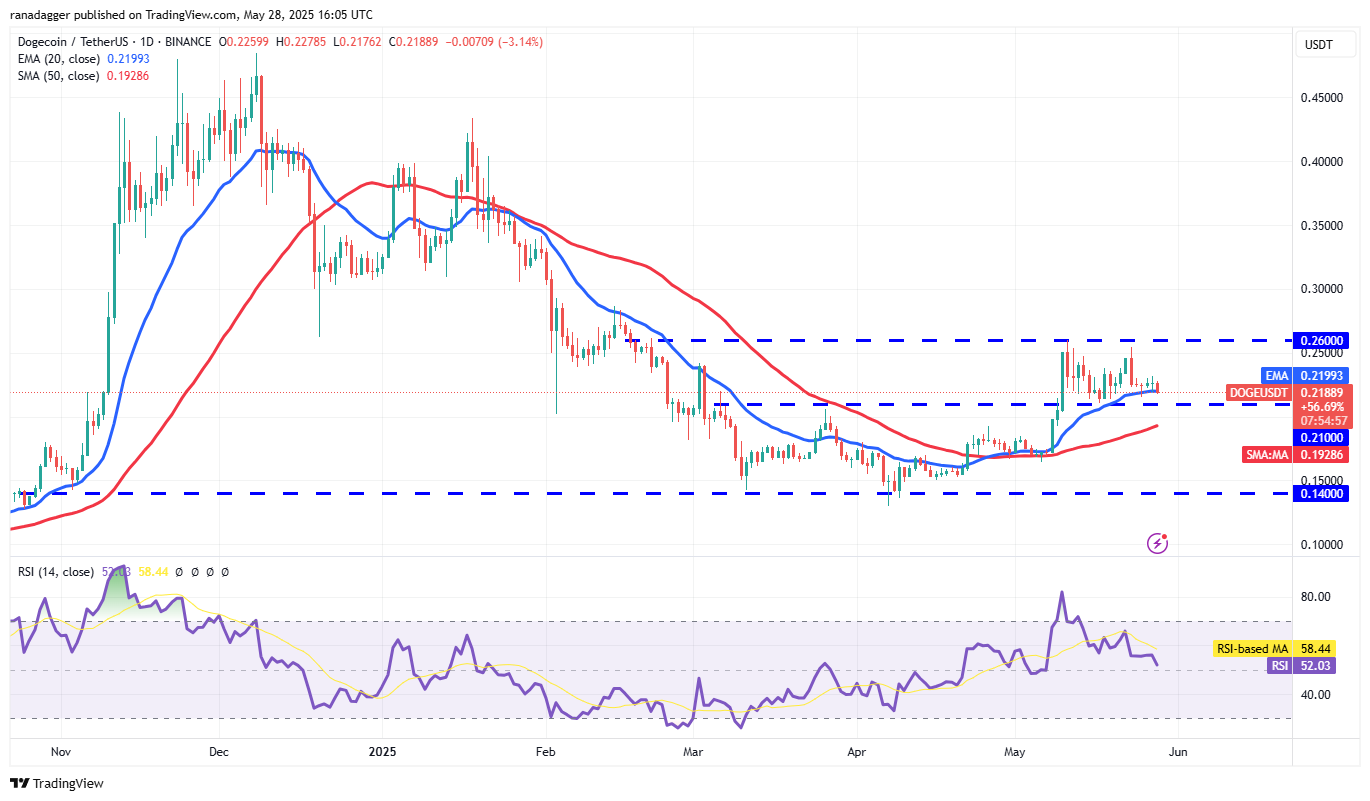 Sellers are trying to pull Dogecoin (DOGE) below the immediate support at the 20-day EMA ($0.22).