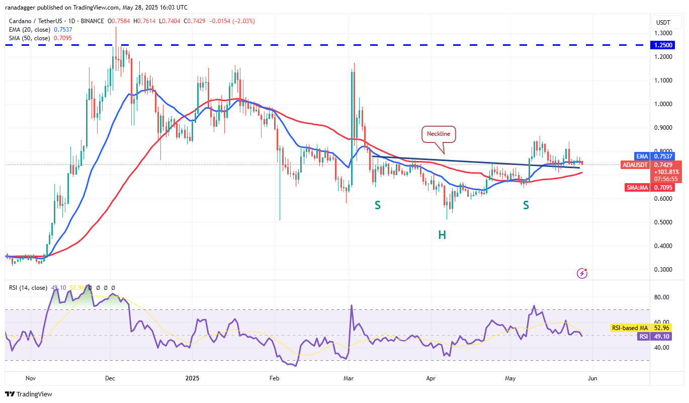 Buyers have managed to keep Cardano (ADA) above the neckline of the inverse head-and-shoulders (H&S) pattern, but the bounce lacks strength.