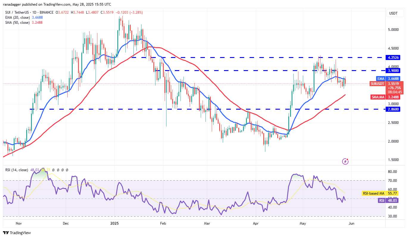 Sui (SUI) turned down from the 20-day EMA ($3.66) on May 28, indicating that the sentiment remains negative and the traders are selling on rallies.