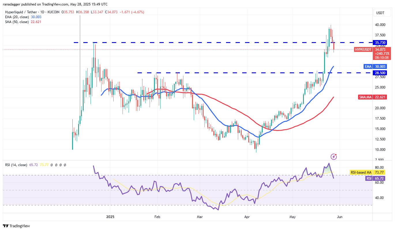 There is support at $32, but if the level cracks, the HYPE/USDT pair could extend the slide to the 20-day EMA ($30). Buyers will try to start a bounce off the 20-day EMA but may face stiff resistance at $35.73.