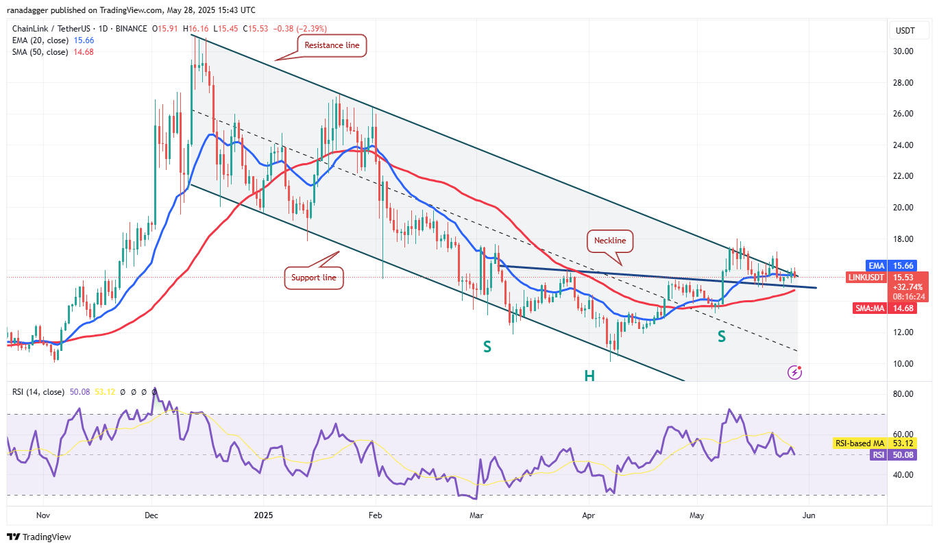 Chainlink (LINK) continues to find support at the neckline of the H&S pattern, but the bulls have failed to start a strong rebound.