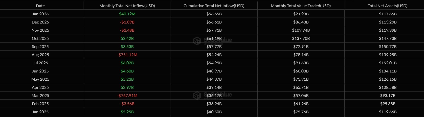 Monthly ETF flow data since 2025. Source: SoSoValue