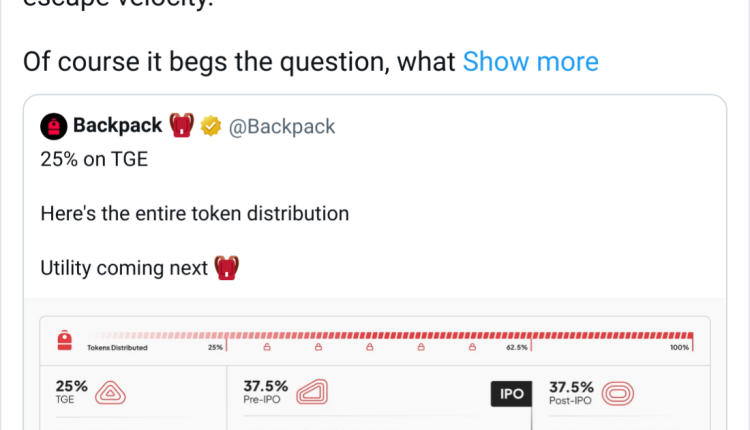 Ferrante, an early employee at the FTX-linked Alameda Research, added that none of the Backpack team or investors should gain wealth from the token “until the product hits escape velocity,” which he said would happen when the company launches an initial public offering.