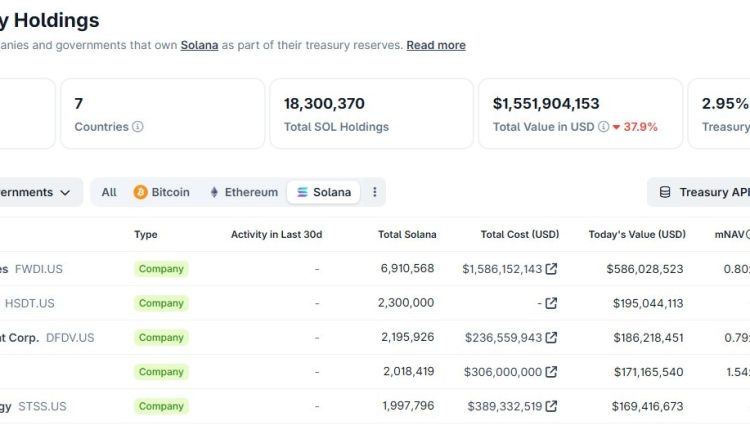 Publicly listed companies that hold Solana as a treasury asset are sitting on more than $1.5 billion in unrealized losses, based on disclosed acquisition costs and current market prices tracked by CoinGecko.