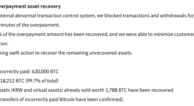 The exchange’s promotional event, which was intended to reward users with 2,000 South Korean won ($1.40), resulted in 2,000 BTC per user due to an employee mistakenly entering “BTC” as the currency unit instead of “won,” he said.