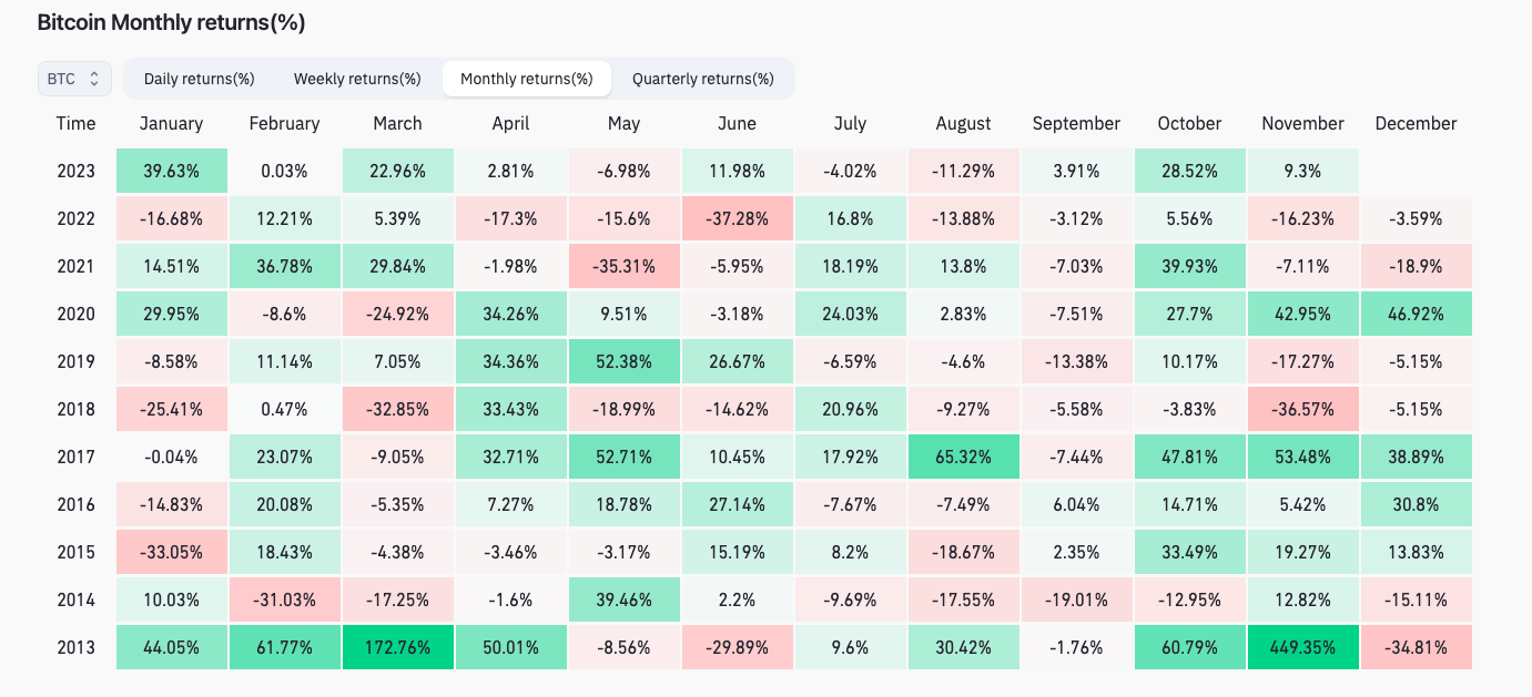 In November 2021 and 2022, Bitcoin fell 7.1% and 16.2%, respectively, per data from statistics resource CoinGlass.