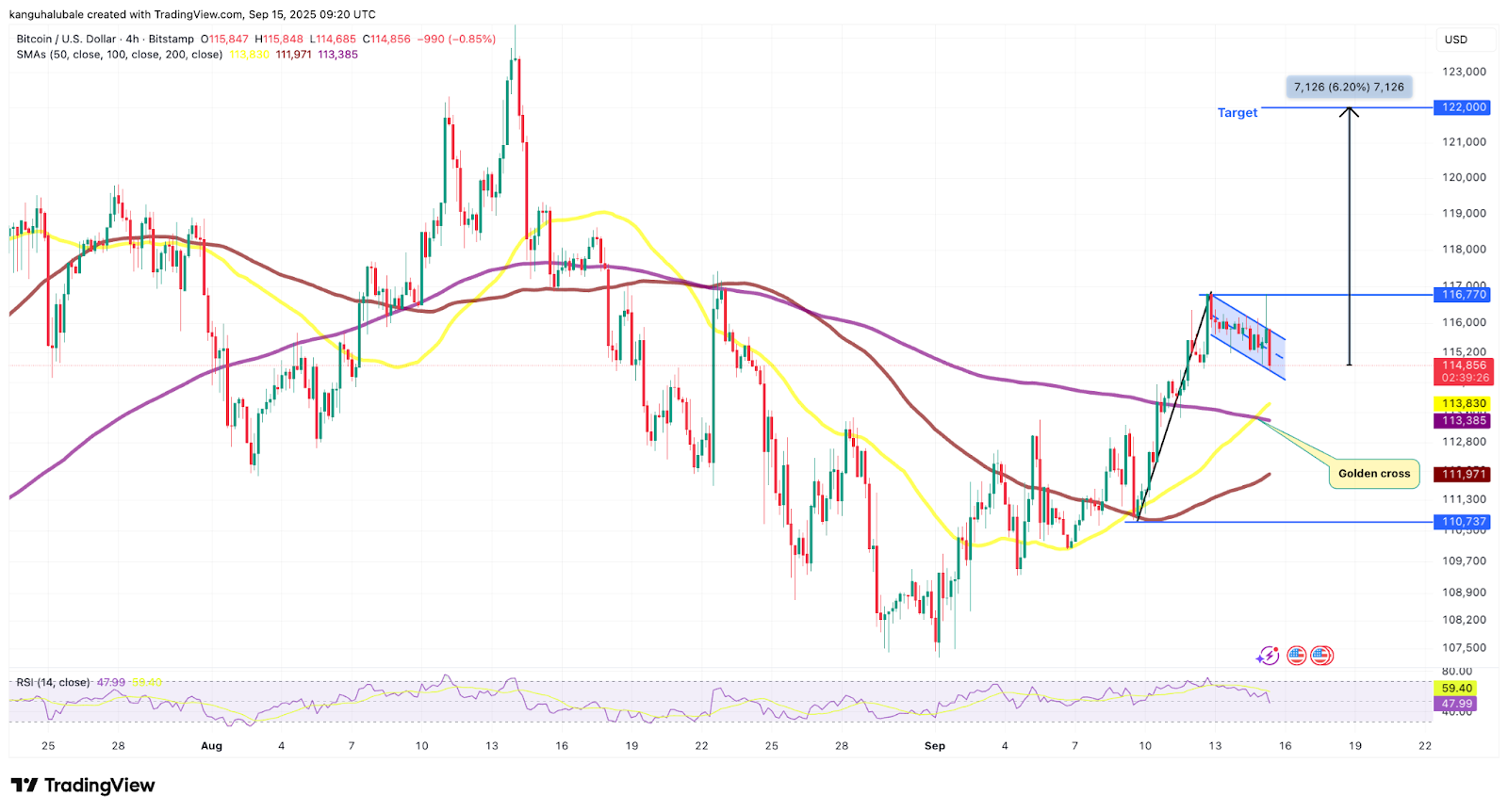 A four-hour candlestick close above the flag at $115,800 would confirm a bullish breakout, paving the way for a run-up to the technical target of the prevailing chart pattern at $122,000. Such a move would bring the total gains to 6% from the current levels.
