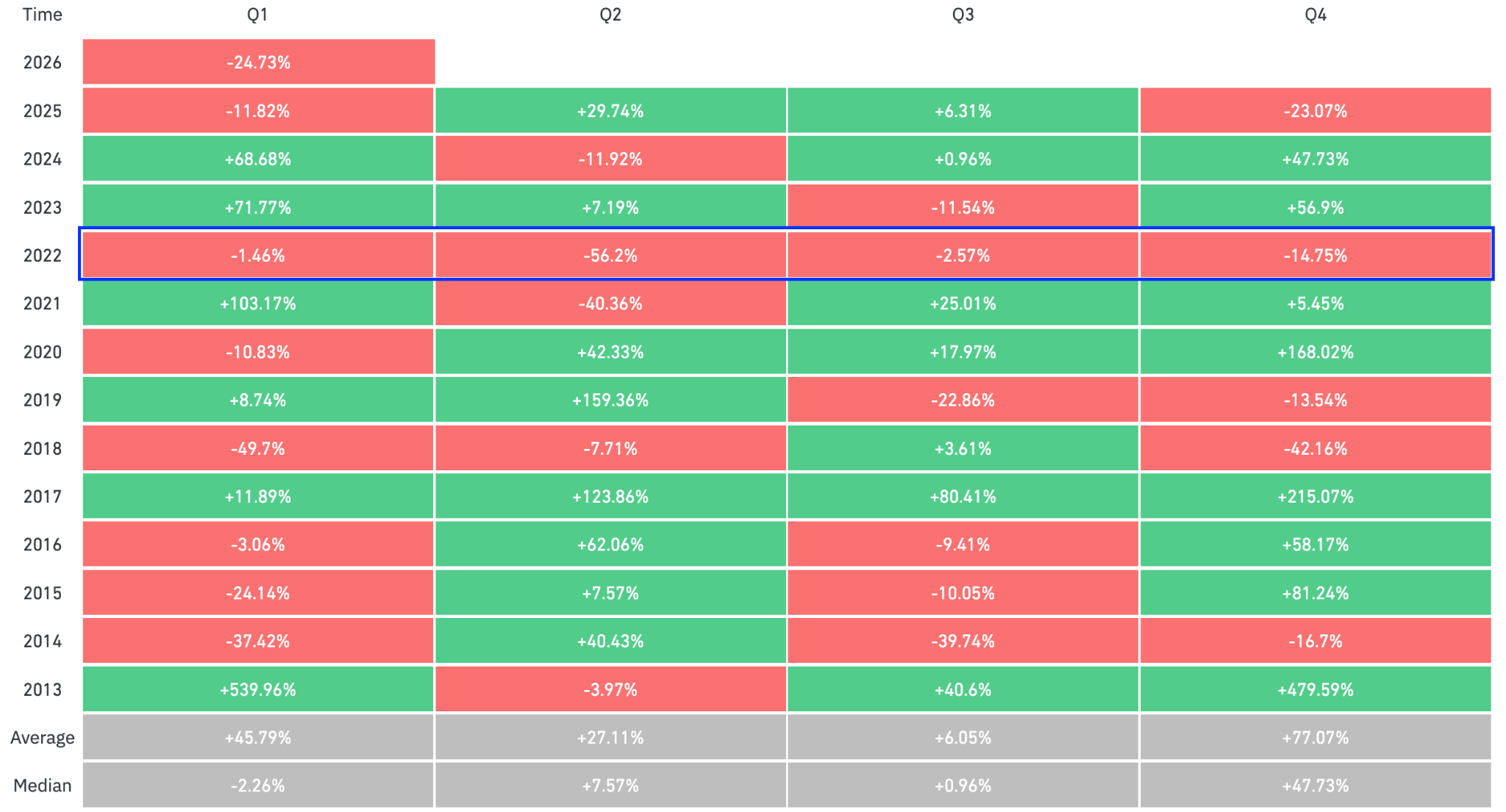 Analyzing Bitcoin’s quarterly performance during the 2022 bear market provides a more cautious interpretation of BTC price history. The data shows Bitcoin recorded four consecutive red quarters during that year.